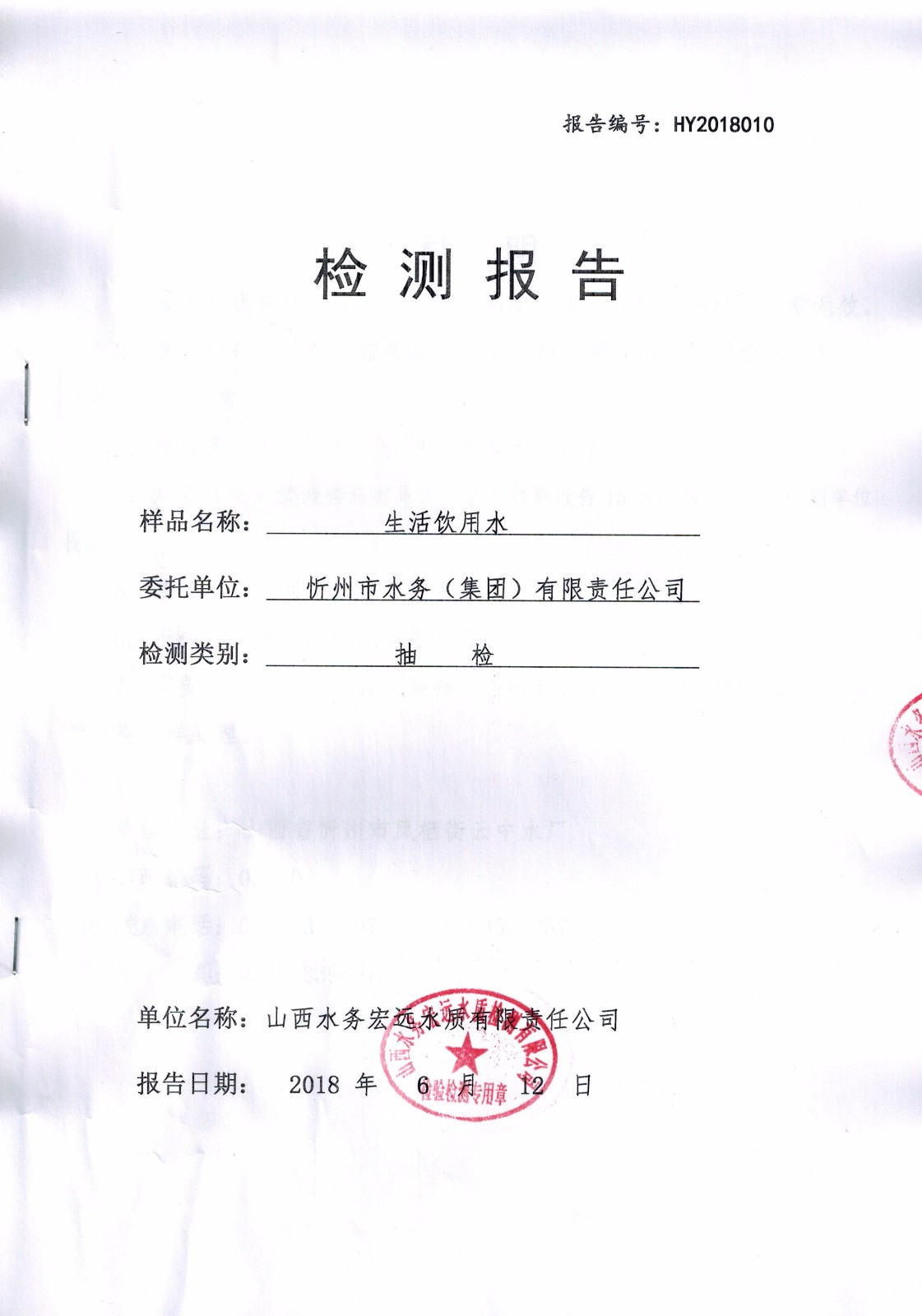 忻州城區(qū)公共供水水源水、出廠水、管網(wǎng)水、管網(wǎng)末梢水2018年6月份水質(zhì)信息公示