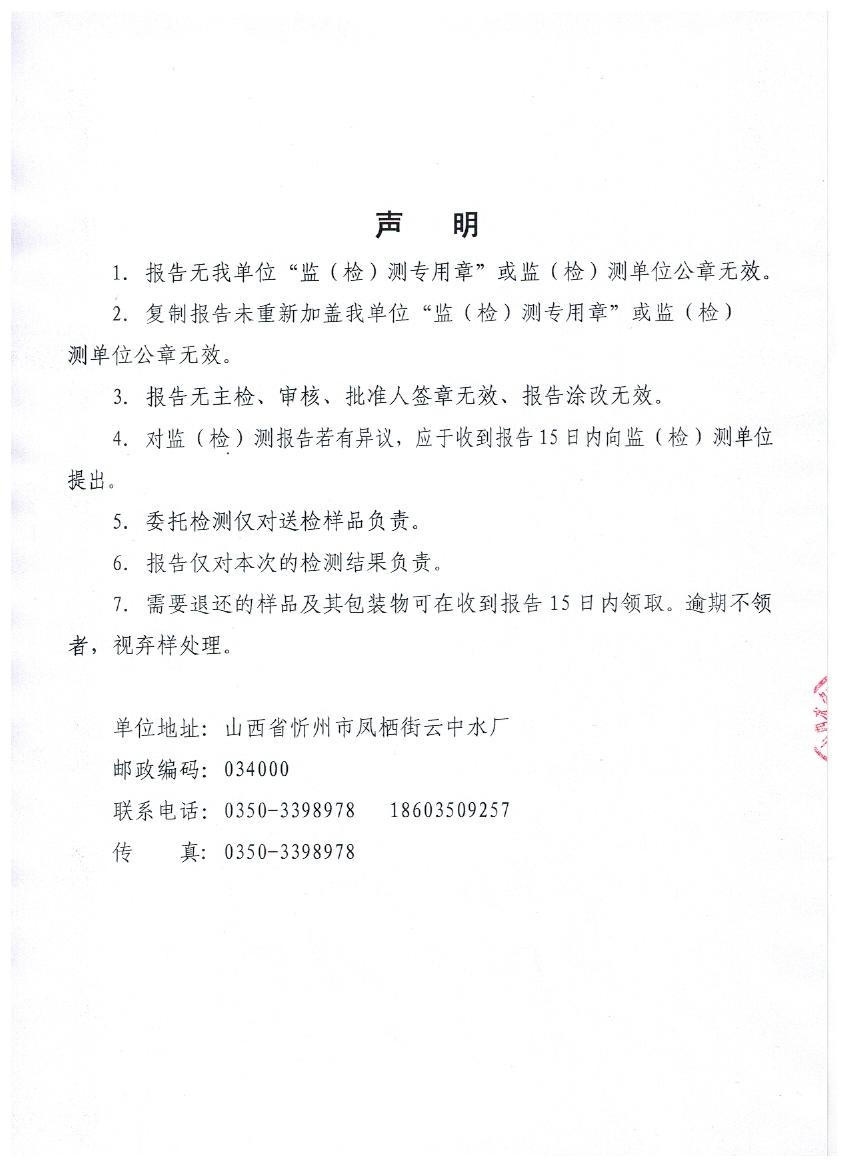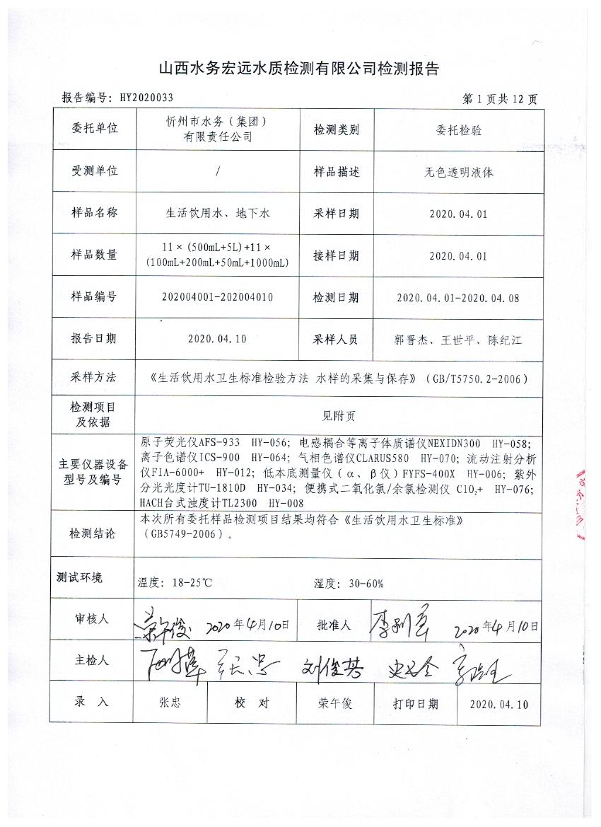 忻州城區(qū)公共供水水源水、出廠水、管網水、管網末梢水2020年4月份水質信息公示