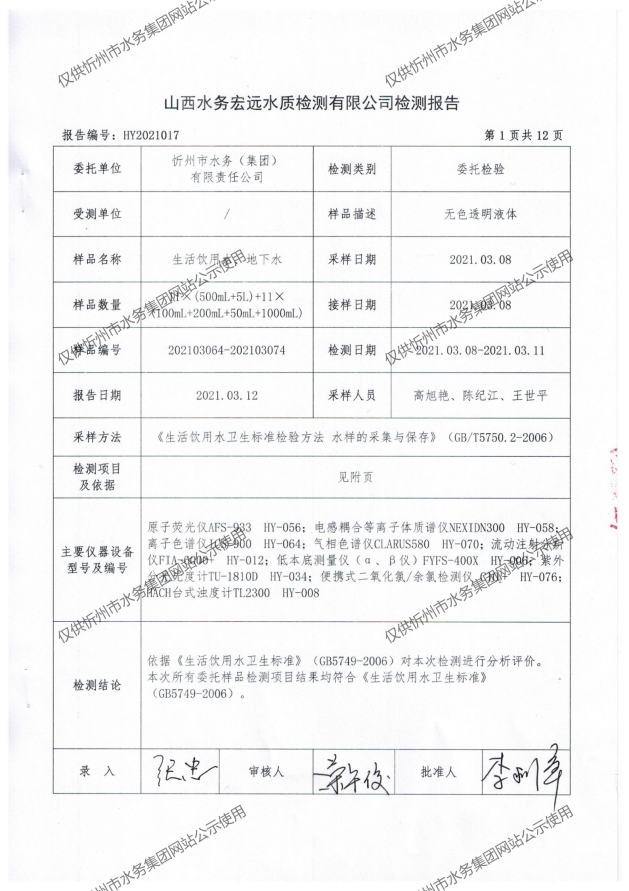 忻州城區(qū)公共供水水源水、出廠水、管網(wǎng)水、管網(wǎng)末梢水2021年3月份水質(zhì)信息公示