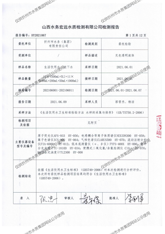 忻州城區(qū)公共供水水源水、出廠水、管網水、管網末梢水2021年6月份水質信息公示