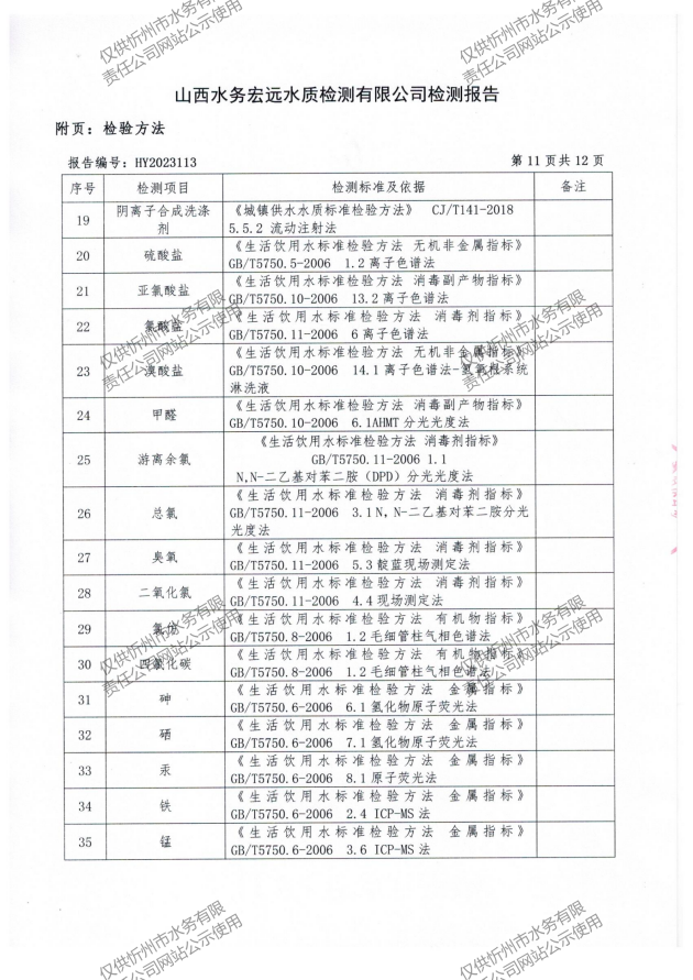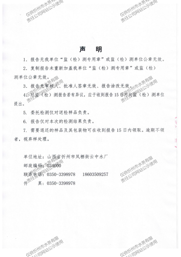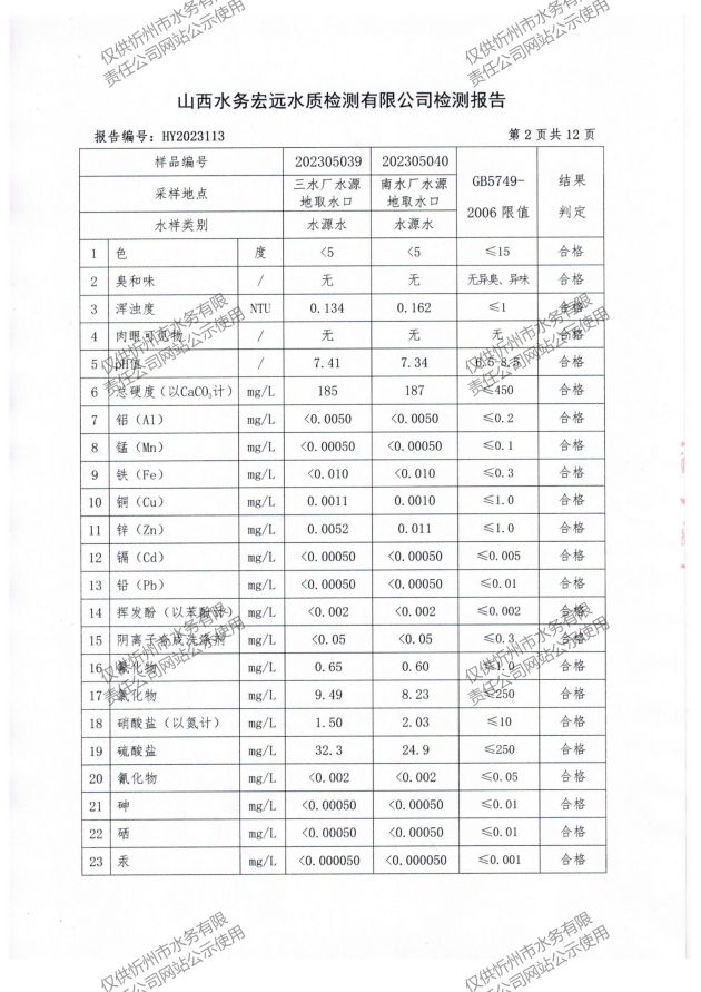忻州城區(qū)公共供水水源水、出廠水、管網水、管網末梢水2023年5月份水質信息公示